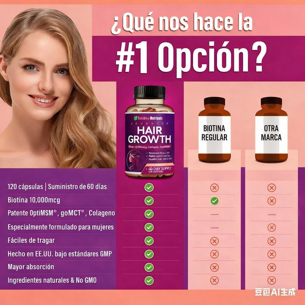 Nuestra fórmula avanzada combina biotina de alta potencia, colágeno y nutrientes premium para ofrecer resultados superiores frente a otras alternativas del mercado. Diseñada para quienes buscan un cabello más fuerte, más largo y visiblemente más saludable.